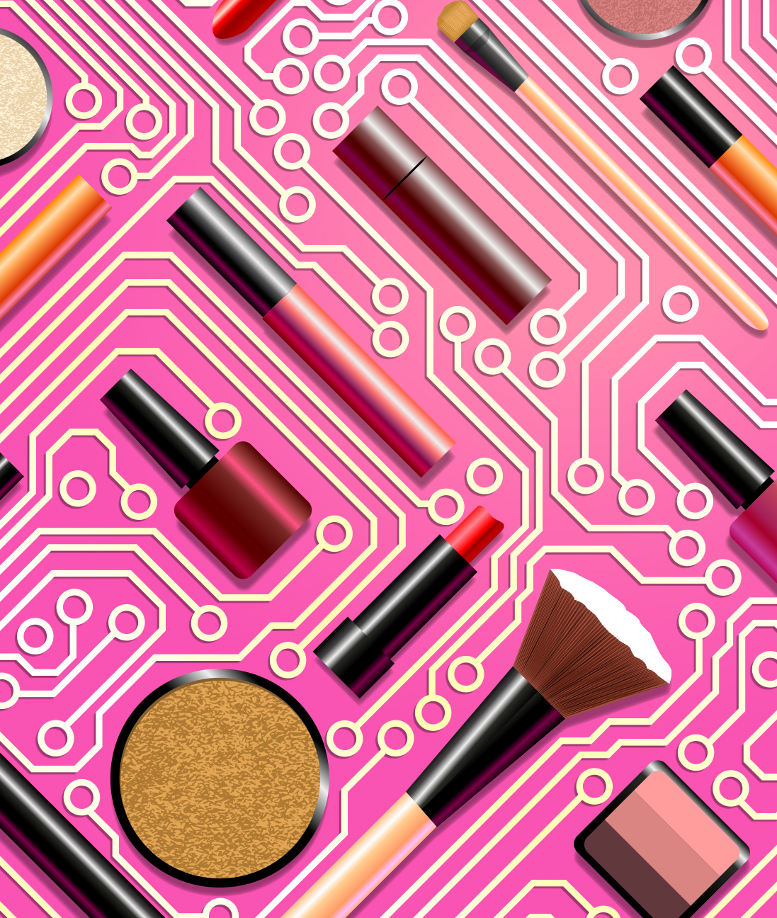 Full-page and interior illustrations about artificial intelligence being used to create beauty products. ︎